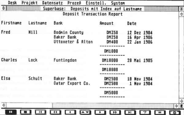 Die Suchfunktion, die über eine "Taste" in der Benutzeroberfläche zu aktivieren ist, bezieht sich nur auf die momentan aktuelle Datei. Der "Filter" kann alle Datenfelder (auch gleichzeitig) berücksichtigen, egal ob es Index-, Datum-, Zeit- oder sonstige Felder sind. Als Verknüpfungen stehen die üblichen Funktionen wie z.B. =, >, AND, OR, wildchars* und ? und die vier Grundrechenarten zur Verfügung- Beim Durchschauen der einzelnen Datensätze- daß geht auch über Tasten am unteren Bildschirmrand, die vergleichbar mit denen eines Recorders sind werden nach Einrichtung eines solchen Fillers nur die Datensätze angezeigt, die die Bedingungen erfüllen. Wird ein bestimmter Datensatz gesucht, kann zusätzlich zum Filter auch über den aktuellen Index gesucht werden. Index bedeutet dabei, daß in einer extra Datei die alphabetische oder numerische Ordnung des Indexfelds gespeichert ist. wodurch die Suche erheblich beschleunigt wird. Pro Datei können maximal 999 Indexfelder definiert werden. Diese Filter sind bei allen Ausgabefunktionen einsetzbar. egal, ob das Zielmedium der Drucker, ein externes File oder eine neue Datenbankdatei ist. Zum selektiven Löschen taugt er natürlich auch.