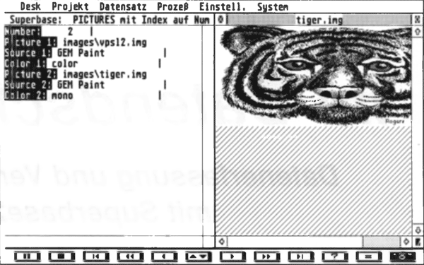 Um wieder auf unsere Plattensammlung zurückzukommen: Wollen Sie auch die Musiktitel und Namen der Musiker speichern, dabei aber keine feste Struktur im Datensatz festlegen, können Sie in Super base ein Feld als Zeiger auf eine externe Textdatei einrichten. Diese kann mit dem integrierten oder einem anderen Editor erstellt und nach Belieben gestaltet werden. Dabei sollte aber der erhöhte Speicherbedarf berücksichtigt werden. Ein File belegt auf einer ST-Diskette mindestens 1 KByte, auch werden Suchzeiten in externen Dateien beachtlich erhöht. Sie müssen ja ständig nachgeladen und Zeile für Zeile nach der angegebenen Zeichenkette durchsucht werden. Aber immerhin kann gesucht werden. Oder wollen Sie das Cover der Platte digitalisieren und abspeichern? Kein Problem, auch können Sie Text, Covervorder- und rückseite zusammen speichern, also beliebig viele externe Dateien in einem Datensatz verwalten. Sollten Sie aber wirklich ans Digitalisieren denken, würde ich Ihnen raten, gleich mit Superbase eine 120 MByte-Festplatte zu kaufen. Die externen Dateien, ob Text oder Bild, können bei Bedarf in einem separaten Fenster dargestellt werden, allerdings nur eine Datei auf einmal.