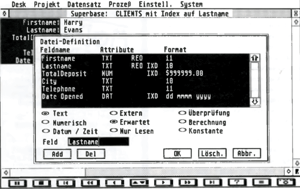 Soweit zur Ausgabe. Um Dateien benutzen zu können, muß zuerst eine Maske definiert werden. Dazu dient der Menüpunkt Neu in Projekt. Wird dieser Menüpunkt gewählt, kann nach Eingabe des Dateinamens ein Paßwort vergeben werden um die Daten gegen unberechtigtes Einsehen oder Manipulation zu schützen. Ist die Datei dem System soweit bekannt, geht es an das Vergeben von Feldnamen, Datentyp und einigen Optionen. Zu diesem Zweck öffnet sich eine Dialogbox, die leider keine GEM-Dialogbox ist. Leider deshalb, weil man gewohnt ist, eine Dialogbox zu bedienen und nicht für jedes Programm neu lernen möchte. Da Superbase aber vom AMIGA kommt, haben die Entwickler wohl dessen Dialogboxen übernommen. Neben der schlechten inversen Darstellung (schwarze Dialogboxen) und den zierlich kleinen, runden Anwählbuttons ist die Texteingabe völlig anders gelöst. Wenn die Boxen wenigstens besser zu bedienen wären, hätte ich vielleicht nichts gegen die Abweichung vom Standard, so kann ich mich nur aufregen. Soweit so schlecht.