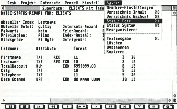 Damit bin ich schon bei dem gravierenden Manko von Superbase2. Verknüpfe ich meine Dateien, möchte ich auch sehen, welche Datensätze zusammengehören. Es ist aber nicht möglich, ein Formular zu erstellen, in dem Datenfelder aus mehreren Dateien angezeigt werden, obwohl dies in der Einleitung erklärt wird. Das kommt von der künstlichen Abspeckung der Programme, um ein billiges Produkt auf den Markt werfen zu können und dabei zu beiden, der Profi- und der abgespeckten Version, in großen Teilen identische Handbücher auszuliefern. Hinweise auf die AMIGA-Version von Superbase möchte ich eigentlich auch in keinem ST-Handbuch lesen. Mich hat es einige Zeit gekostet, bis ich die Unfähigkeit dem Programm und nicht mehr mir zuweisen konnte. Bei der Eingabe neuer Daten hat es sich als sehr hinderlich erwiesen, daß auch immer nur ein Datensatz auf dem Bildschirm darstellbar ist. Werden Daten aus einer anderen Datei benötigt, muß diese erst geöffnet werden, wodurch die gerade edierte vom Bildschirm verschwindet. Da auch ein Clipboard fehlt, müssen die Daten auf Datei, Papier (mittels Drucker oder Bleistift) oder einfach ins Gedächtnis ausgelagert werden, danach muß wieder die ursprüngliche Datei geöffnet und die externen Daten in die Felder eingetragen werden. Viel Spaß beim Erfassen umfangreicher Daten!