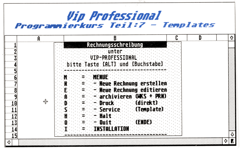 Wie im letzten Teil angekündigt, wollen wir uns heute mit der Programmierung eines Templates, also einer Anwendung unter der VIP-Schale beschäftigen. Vielen Leserbriefen konnte ich entnehmen, daß Vip sehr oft in kleineren Unternehmen eingesetzt wird, um Rechnungen. Tabellen und Kassenbücher zu erstellen. Ich möchte Ihnen anhand des Templates Rechnung.WKS aufzeigen, wie elegant und dennoch einfach man mit VIP eine Automatisierung solcher Rechnungsschreibungen vornehmen kann.