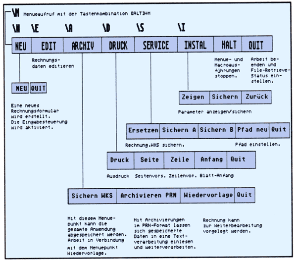 Das Erstellen eines Menüplanes für die Anwendung ist immer Ausgangspunkt für die ersten Macroschritte in unserem Template. Die Abbildung 3 zeigt den Menübaum, der in Rechnung.WKS seine Anwendung findet.