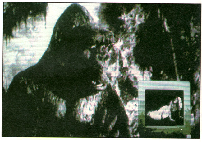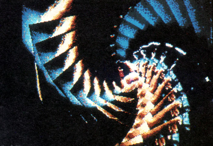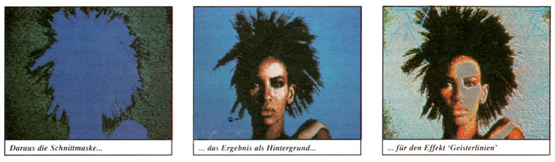 Als Ăberblendung suchen wir uns den IMAGIC-Effekt âFLIPPERâ aus, der zufĂ€llige Zackenlinien auf den Bildschirm zeichnet. Wie löst man aber das Problem, daĂ die Linien nur genau um den Kopf herum erscheinen sollen, nicht aber ĂŒber das Gesicht selbst hinweg gezogen werden? Nun, die Lösung besteht darin, daĂ man eine Kopie von diesem Bild erstellt, in der man den gesamten Hintergrund durch die Farbe der Zackenlinien ersetzt, den Kopf selbst aber in beiden Bildern gleich lĂ€Ăt. SpĂ€ter wird dann mit âFLIPPER" das gesamte Bild ĂŒberblendet, somit erscheinen die Linien, als wĂŒrden sie nur um den Kopf herum gezeichnet.