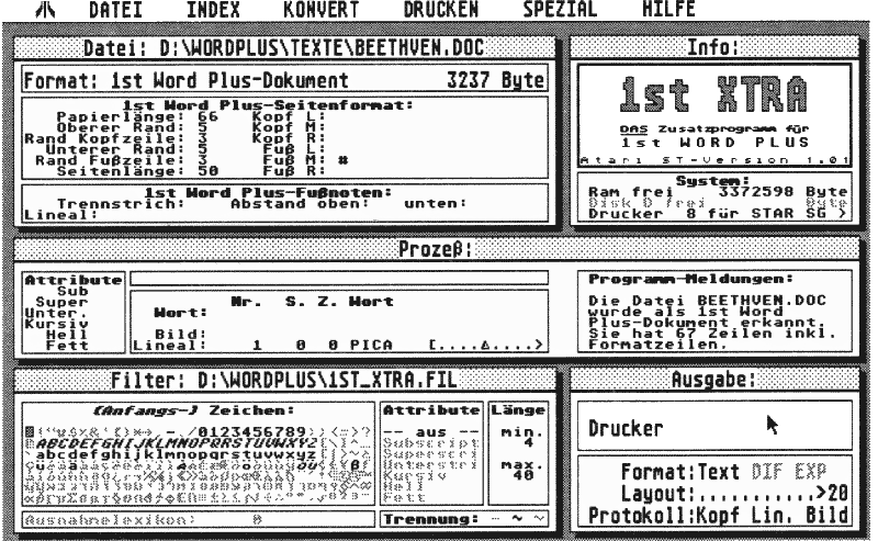 Außer den üblichen Umwandlungen von ASCII- nach Wordplus-Format und umgekehrt kann 1st Xtra auch Text aus GEM-Metafiles extrahieren und im ASCII- oder Wordplus-Format abspeichern. Die Analyse und Anpassung fremder Wordplus-Druckeranpassungen wird durch eine Funktion möglich gemacht, die CFG-Files wieder in lesbare und kommentierte HEX-Dateien zurückübersetzt. Schließlich können diverse Bildformate konvertiert werden: GEM-Image-, STAD-, Neochrome-, Doodle- und DEGAS-Dateien werden gelesen und wahlweise als STAD-. Doodle- oder DEGAS-Bilder gespeichert.