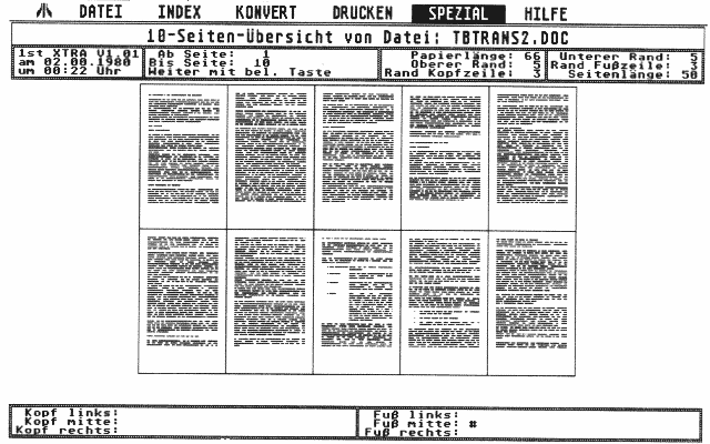 Eine weitere sehr nützliche Sache für Wordplus-Layouts ist die Seitenübersicht. Zehn Seiten können hier klein und natürlich völlig unleserlich auf einmal angezeigt werden. Man bekommt dadurch einen exzellenten Eindruck vom Aussehen des gedruckten Layouts, inklusive der Lage der Kopf- und Fußzeilen und auch der Fußnoten.