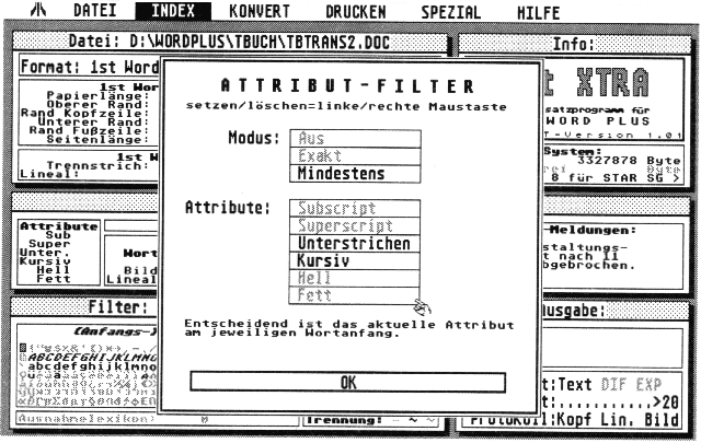 Aus beliebigen Wordplus-Dateien kann 1st Xtra Indizes, Inhaltsverzeichnisse und Ergänzungslexika für die Wordplus-Rechtschreibprüfung generieren. Dazu dient ein Filter, der nur Wörter, die einer ganzen Skala von Bedingungen genügen, passieren läßt. Eine Bedingung ist die Auswahl von Zeichen, mit denen ein Wort beginnen darf. Jede beliebige Kombination von Zeichen aus dem ATARI-Zeichensatz ist für diesen Zweck definierbar. Auch läßt sich die Auswahl auf Wörter einschränken, deren Länge zwischen einer minimalen und maximalen Zeichenzahl liegt. Die Schriftattribute wie z,B. Fett- oder Kursivschrift sind ein anderes Kriterium. Auch hier sind beliebige Kombinationen, sogar Mindestanforderungen, möglich (z.B. alle Wörter, die mindestens fett, möglicherweise aber auch fett und kursiv oder fett und unterstrichen dargestellt sind). Selbst die Behandlung von manuellen oder automatischen Silbentrennungen kann eingestellt werden, schließlich ermöglicht die Verwendung eines Ausnahmelexikons, bestimmten Worten, die alle bisherigen Fallen überwunden haben, endgültig den Garaus zu machen.