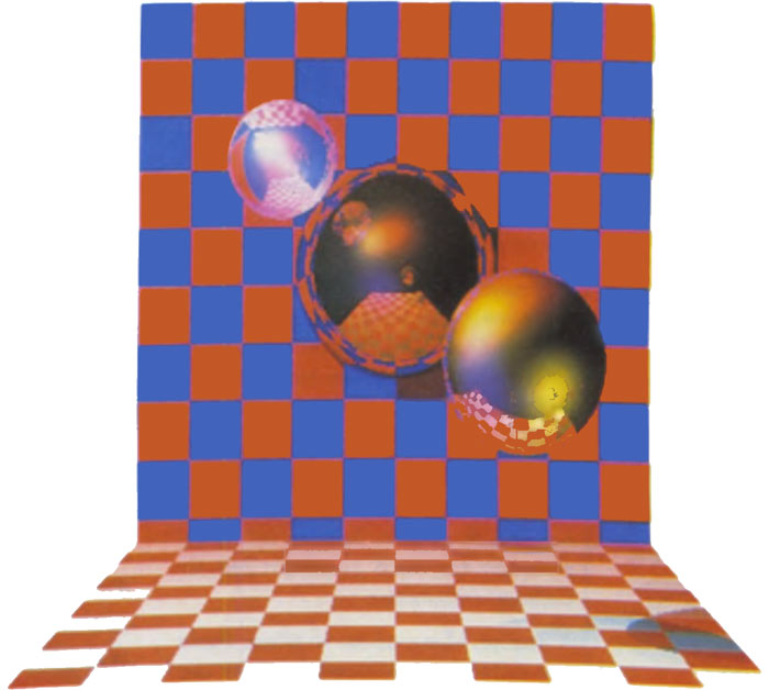 Ein Ray-Tracing Bild, angezeigt im 16-Millionen-Farben Modus. Die Auflösung ist 512*480 Punkte, das Bild wurde ohne Anti-Aliasing berechnet. Die Szene besteht aus 4 Lichtquellen, zwei Ebenen, einer massiven Glas- und zwei Spiegelkugeln. Die Rechenzeit für dieses Bild betrug unter 10 Minuten mit einem Quick-and-Dirty-Demo-Programm (ohne die elementarsten Optimierungen) der ArTTeC-Software GmbH. Beachten Sie dabei, daß der Release 3-ATW nur mit 17.5 MHz läuft.