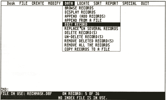 Ferner verfĂŒgt dBMAN noch ĂŒber einen Masken- und einen sehr mĂ€chtigen Report-Generator. So ist es mit dem Maskengenerator beispielsweise möglich, eine Bildschirmmaske zu erstellen, die man zum Ăndern von Daten mit dem Befehl âEDITâ benutzt. Dabei werden dann nur die ausgewĂ€hlten Felder angezeigt. Die Dateien, die der Maskengenerator erstellt, kann man in eigene Anwendungsprogramme einbinden. Mit dem Reportgenerator kann man komfortabel gestaltete Ausgabelisten und auch Etiketten erzeugen. Dabei ist ein Zugriff auf mehrere Dateien gleichzeitig möglich. Eine Erstellung von Listen per selbstgeschriebenem Programm kann in den allermeisten FĂ€llen entfallen. dBMAN wird im Paket mit dem GREASED LIGHTNING-Compiler geliefert. Vergleicht man die AusfĂŒhrungszeiten von Programmen vor und nach der Compilierung, glaubt man tatsĂ€chlich, den âgeölten Blitzâ vor sich zu haben. So braucht dBMAN zum HochzĂ€hlen einer Variablen immerhin 2 Minuten und 38 Sekunden, wĂ€hrend die Laufzeitmaschine nur 18 Sekunden braucht. Diese Werte sind natĂŒrlich extrem, denn den Zugriff auf die Laufwerke kann auch der schönste Compiler nicht beschleunigen. Dennoch lohnt das Compilieren fertiger Anwendungen immer.