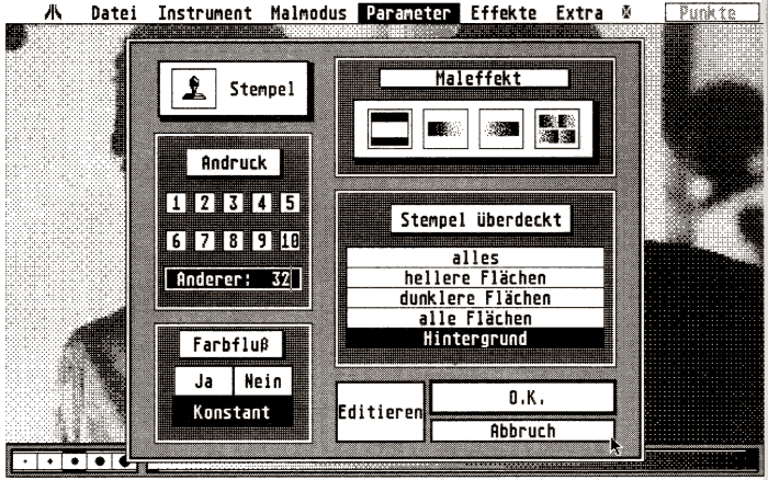 Die Werkzeuge können über zahlreiche Parameter angepaßt werden. Man kann zum Beispiel den Farbfluß so einstellen, daß die Farbe nur auf ganz bestimmten anderen Farben haftet. Der Andruck, also die Farbsättigung beim Zeichnen ist ebenso regelbar wie automatischer Farbverlauf. Der Stempel ist besonders vielseitig: Dieses Instrument ist wie die Pinsel bei anderen Malprogrammen in der Form veränderbar, wobei die einzelnen Punkte aber verschiedene Graustufen malen können.