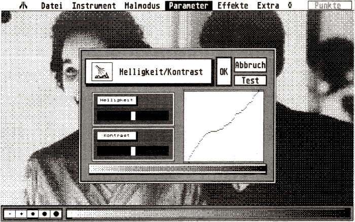 Andere Funktionen erlauben, den Kontrastunterschied zwischen nebeneinanderliegenden Pixeln zu verstärken oder abzuschwächen, wobei sogar verschiedene Bereichsgrößen verwendet werden können. Der Effekt: Schärfere Konturen bzw. Weichzeichner. Die Bildhelligkeit einzelner Bereiche kann ebenfalls beliebig vergrößert oder vermindert werden.
