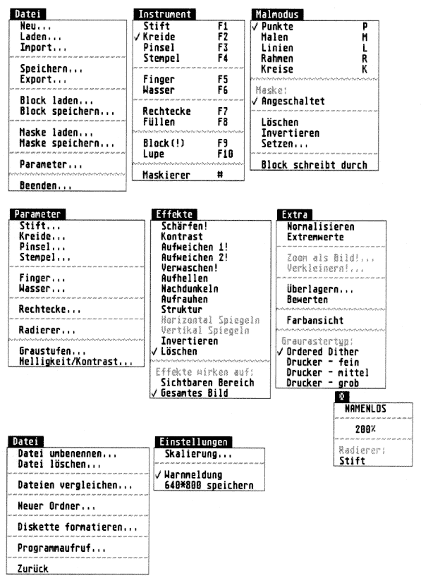 Alle Malfunktionen funktionieren mit 64 Graustufen, es wird direkt mit einem Raster gemalt. Die Malwerkzeuge sind an traditionellen Zeichengeräten orientiert: Sie heißen Stift, Kreide, Pinsel und Stempel. Außerdem gibt es ‘Finger' und 'Wasser', die zum Verschmieren von bereits aufgetragener Farbe dienen. Ein Radierer kann löschen, aufhellen oder auch teilweise restaurieren, also nur Teile von Bildänderungen zurücknehmen. So ein partielles ‘Undo' ist wirklich etwas ganz besonders Feines. Überhaupt kann man in Retouche so ziemlich alles per 'Undo' zurücknehmen.