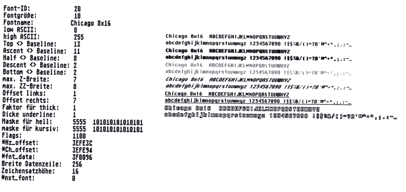 Eine nicht weniger nützliche Funktion (besonders bei der Entwicklung) ist F_Header, womit man sich die Daten des Font-Headers an Adresse() ausgeben lassen kann.