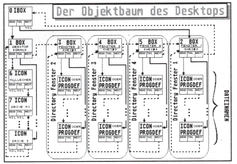 Zwar gibt es mittlerweile eine ganze Reihe von verbesserten Boxen, doch liegt es in der Natur der Sache, daß auch diese nicht an den Komfort der Desktop-Fenster heranreichen. Abhilfe mußte her und so beschloß ich, in den Eingeweiden meines Computers zu wühlen, um festzustellen, wo und wie Informationen über die Directory-Fenster und die darin selektierten Dateien, bzw. Ordner, im Speicher abgelegt werden. Recht schnell fand ich bei dieser Suche den Objektbaum des Desktops (Bild 1) und feste Zeiger auf sein Wurzelobjekt.