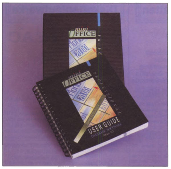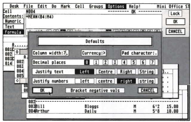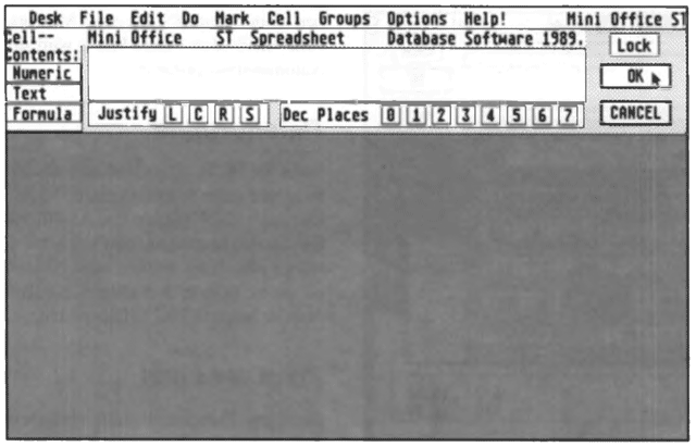 âmini OFFICE - Spreadsheetâ hat die Bedienerleiste oben, also gleich unter der Desktopleiste und erzeugt dann die Tabelle im unteren Bildschirmteil. Viele Funktionen und Einstellungen sind per Pull-Down-MenĂŒ oder Control-Sequenz wĂ€hlbar. Die wichtigsten Optionen, wie etwa Inhaltstyp der Zelldaten (Text, Zahl oder Formel), Formatausrichtung in der Zelle (links, rechts, zentriert), Dezimalstellen bei Zahlen (von 0 bis 7) oder Zellschutz gegen Ăberschreiben, sind stĂ€ndig in der Bedienerleiste sichtbar und zugĂ€nglich.