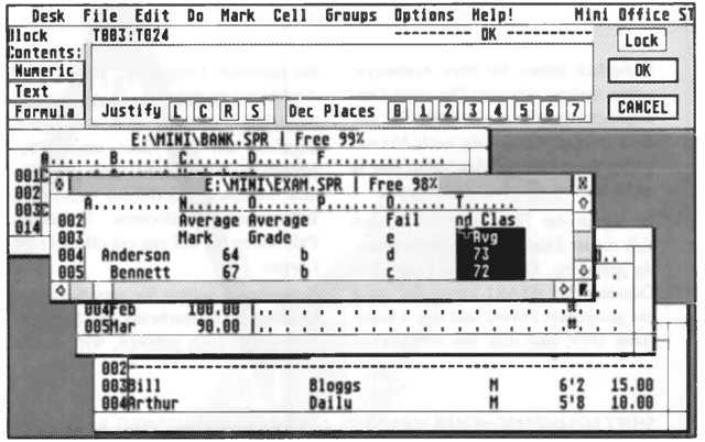 Wenngleich ein Arbeitsblatt eine KapazitĂ€t von 255 Zeilen mal 255 Spalten hat, also sehr viel weniger als die "groĂen Vorbilder", so ist eines bemerkenswert: WĂ€hrend einer Sitzung können vier verschiedene, unabhĂ€ngige ArbeitsblĂ€tter offen und sichtbar gehalten werden! Meines Wissens kann das bisher kein anderes Programm dieser Art. Dies hĂ€ngt aber stark vom restlichen Arbeitsspeicher ab. Zu diesem Zweck ist in der Kopfleiste eines jeden Arbeitsblattes der unbenutze RAM Bereich vermerkt (z.B.: "FREE 99%").