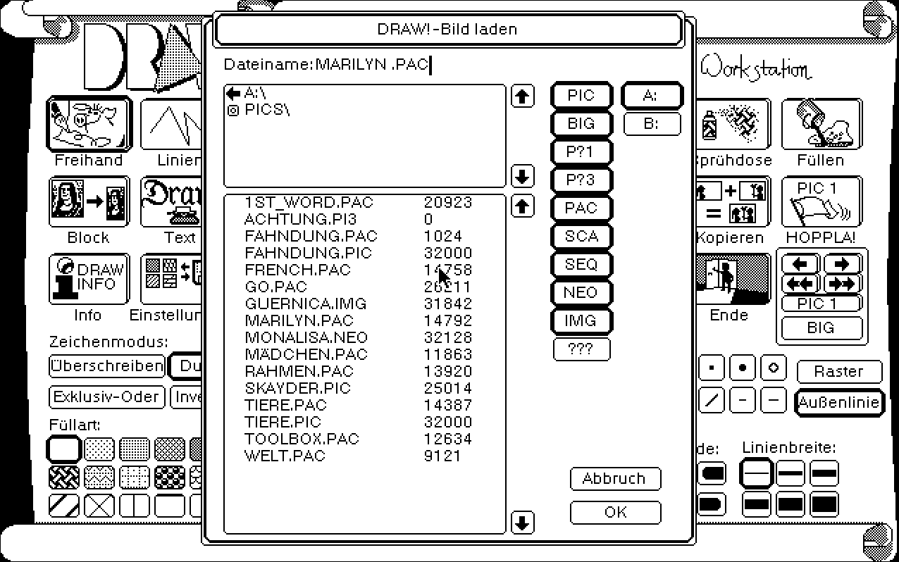 Apropos Dateiauswahl, Draw! benutzt eine eigene Fileselektorbox. Aus Konsistenzgründen ist eine solche Eigenart zwar zutiefst verdammenswürdig, aber dennoch einen Glückwunsch: Die Draw!-Version der geliebten Auswahlbox ist nämlich sehr gelungen und effizient.