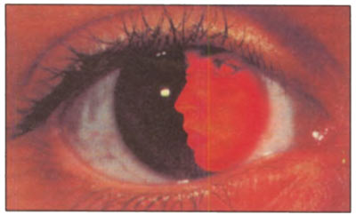 Ein Auge wurde eingescannt und in der rechten Hälfte mit einem farbverfremdeten Gesicht überlagert. Das TmS-Logo wurde mit dem Vektorzeichenprogramm TmS Graphics erzeugt und in Color Express eingeladen.