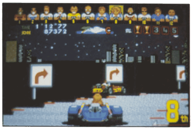 Direkt aus der Spielhalle kommt Powerdrift. Activisions aktionsgeladenes Autorennen mit rasend schneller 3D-Grafik. Vor dem Rennen hat der Spieler die Qual der Wahl zwischen zwölf freakigen Rennfahrern und der Art der Steuerung (Maus oder Joystick). Dann geht die heiße Hatz los. Zwölf Wagen stehen an der Startlinie. Motorengeheul, der ST schreit: "Three. Two. One. Go!”. Stick nach vorne. und die Rennmaschine gibt Vollgas. Es geht über Stock und Stein, durch Wüste, Schnee, Matsch und Schlamm, rauf und runter, bei Tag und Nacht, insgesamt findet die Raserei auf 27 verschiedenen Pisten statt. Um sich für den nächsten Kurs zu qualifizieren, muß man nach vier Runden unter den ersten drei Plätzen vertreten sein. Das ist gar nicht so einfach. Deshalb sollte man immer mit Vollgas fahren und so selten wie möglich den Wagen in den Kurven abbremsen. Wer Powerdrift am ST spielt, dem wird schnell schwindelig. Die 3D-Grafik ist atemberaubend schnell und fast so gut wie die des Vorbildes aus der Spielhalle, wenn auch ein wenig ruckeliger. Manchmal ist die Action so unheimlich schnell, daß man mit dem Auto von Auffahrten herrunterkracht und zu Boden fällt. Manche Pisten haben eher Ähnlichkeit mit einer Achterbahn als mit einem Autorennkurs. Powerdrift ist das wildeste Autorennen. das es derzeit gibt. Da stimmt einfach alles. Abwechslungsreiche Hintergrundgrafiken, herrliche Animationen, die besonders bei Unfällen voll zur Geltung kommen. Außerdem gibt es eine aufpeitschende Musik von Uncle Art und eine dramatische Sprachausgabe. Für mich ist Powerdrift die beste Sega-Konvertierung, die Activision bisher zustandegebracht hat. Wenn man das Spiel mit dem enttäuschenden Afterburner aus dem letzten Jahr vergleicht, ist bei Activision ein deutlicher Aufwärtstrend in Sachen Spielhallenumsetzung festzustellen. Weiter so!