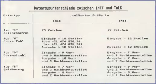 Zwischen der Deklaration in INIT und der AusfĂŒhrung durch TALK sind Unterschiede in der Dimensionierung von Datenfeldern zu beachten.