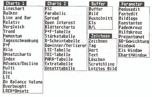 Es ist wirklich zu empfehlen, sich per Handbuch erst einmal einen Ăberblick von CW-CHART zu verschaffen, denn es besteht aus vier eigenstĂ€ndigen Programmen: 1. CHART, 2. DEPOT, 3. BTX und 4. TIMER. Wenn auch unser Hauptaugenmerk auf die Möglichkeiten der Analyse gerichtet bleiben soll, darf die Depotverwaltung nicht unerwĂ€hnt bleiben. Wie schon in frĂŒheren Berichten hervorgehoben wurde, bietet sich die âNebenbei"-Verwaltung eigener Aktien durch ein Analyseprogramm geradezu an. Zu den Modulen âCW-BTXâ und âCW-TI-MER" spĂ€ter mehr.