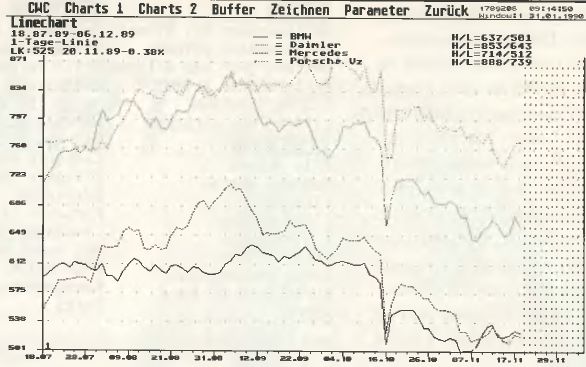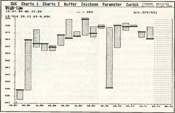 Jetzt wird die StĂ€rke von CW-CHART richtig deutlich: In den MenĂŒpunkten âCharts 1 â und âCharts 2" sind sage und schreibe 33 verschiedene grafische Darstellungsarten untergebracht - das ist eine wahre Fundgrube fĂŒr den Analytiker! So begegnen uns dort Begriffe (die in dem Grundlagenartikel von Heft 2/90 nĂ€her beschrieben wurden) wie Linie. Balken. Momentum. Point & Figure, High/Low. Aber auch eine Vielzahl von Tabellen ist hier zu finden.