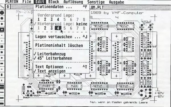Das Leiterplatten-CAD-System Platon von VHF-Computer stand uns in seiner Version V1.4 zur Verfügung. Es ist insbesondere auf die Belange des gehobenen Hobby- und des semiprofessionellen Bereichs zugeschnitten. Zum Preis von DM 298.- sind im Lieferumfang zwei Disketten und ein Handbuch in Form eines DIN A5-Ordners enthalten. Das Programm ist nicht kopiergeschützt, was für Festplattenbenutzer interessant ist. Nebenbei kann man so Sicherheitskopien zum eigenen Gebrauch leichter anfertigen.