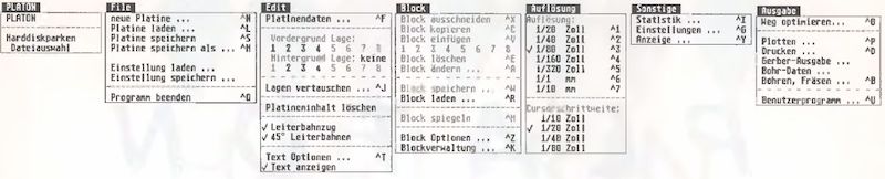 Leider unterstützt das Programm nicht den Farbmodus, in dem man mehrere Lagen einer Platine schön übersichtlich darstellen könnte. Dies scheitert aber wohl an der zu niedrigen Farbauflösung der ST-Modelle. Mit einer hochauflösenden Farbgrafikkarte könnte man dem vielleicht abhelfen, zum Test stand mir leider keine zur Verfügung. Laut Handbuch ist das Programm in der Lage, mit einem Großmonitor zu arbeiten.