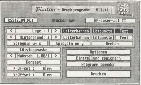 Beim Installieren von Platon V1.4 können fast alle Möglichkeiten der Plotter, Drucker und XYZ-Anlagen eingestellt werden, so daß auch exotische Ausgabegeräte angeschlossen werden können. Leider sind nur die Druckertreiber für die Epson-Drucker FX80 und LQ1000 sowie HP Laser-Jetll mitgeliefert. Beim Laser-Jet-Treiber ist es schade, daß er nicht mit dem HP-Desk-Jet funktioniert. Der Treiber geht von einem Seitenspeicher aus, der dem Desk-Jet leider nicht zur Verfügung steht. So kommt es, daß die Leiterbahnen auf zwei Druckzeilen komprimiert werden, die Lötaugen dann jedoch richtig auf dem Papier erscheinen. Vielleicht läßt sich da ja noch etwas machen. Besitzer anderer Drucker, vor allem von NEC und ATARI-Laser SLM804, müssen die Druckertreiber selber vor der Installation konfigurieren. Diese Arbeit sollte bei jedem guten Programm überflüssig sein. Mit der Ansteuerung der Laserdrucker sind perfekte und schnelle Ausdrucke möglich. Der Plotter-Treiber unterstützt u.a. einen HP 7475-Plotter.