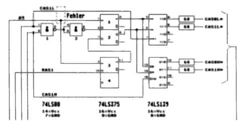Leider ist uns in der Schaltung zum Artikel "Aus dreieinhalb mach drei" ein Layoutfehler unterlaufen. Die Leitung von Pin 9 des 74LS375 muß auf A9 gehen, nicht auf CAS1L (s. gestrichelter Rahmen).