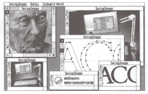 Immer leistungsfähigere Scanner und Videodigitizer verlangen nach ebenso leistungsfähiger Software zur Weiterverarbeitung. Swing Image verarbeitet Bilder mit 2, 4, 16,64 oder 256 Graustufen. Alle Werkzeuge wie einstellbare Stifte. Weichzeichner etc. arbeiten in allen Graustufenmodi und Zoom-Stufen. Bis zu sieben Bilder können gleichzeitig im Speicher behalten werden. Gerasterte Bilder können in echte Graustufenbilder umgewandelt werden. Außerdem besitzt das Programm einen Teil zur Bearbeitung von Vektorbildern.