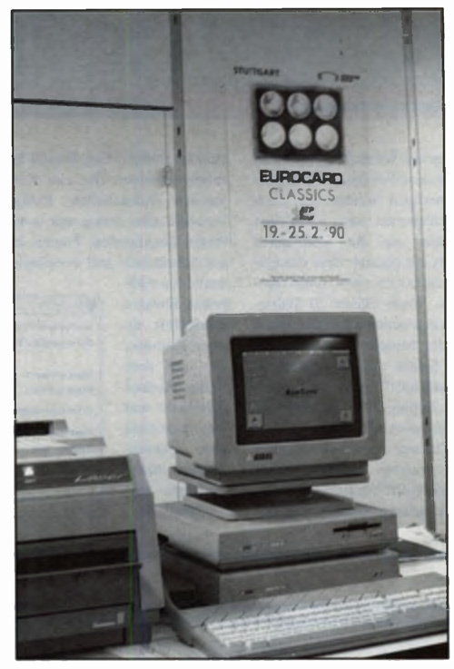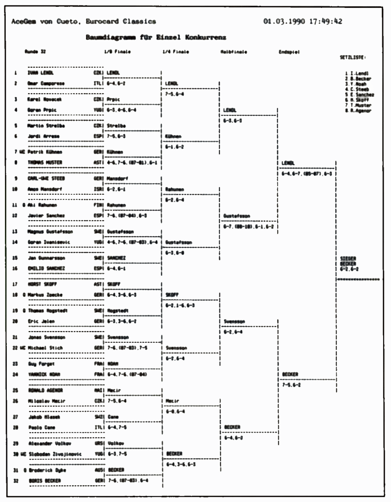 Ihr Bruder Marc, der oft als Coach zu vielen Turnieren seiner Schwester mitreiste, bemerkte, daß bei der Verwaltung der Spieler, Schiedsrichter, Begegnungen und Preisgelder einiges im Argen lag. Diese Dinge wie auch die Entscheidung, wer auf welchem Platz gegen wen spielt, wurden seinerzeit noch per Hand und Schreibmaschine getroffen. Computer waren bei Turnieren selten anzutreffen, und wenn einer zugegen war, wurde die Platzverteilung mit einem simplen Textverarbeitungsprogramm getroffen - auch nicht viel rationeller als mit einer Schreibmaschine und kopierten Vordrucken, eher wesentlich umständlicher. Bild 1 zeigt die Anlage, mit der bei den Stuttgarter Eurocard Classics gearbeitet wurde, in Bild 2 sehen Sie ein komplettes Baumdiagramm der Einzelbegegnungen der Eurocard Classics, erstellt mit AceGem auf einem ATARI Laser Drucker SLM 804.