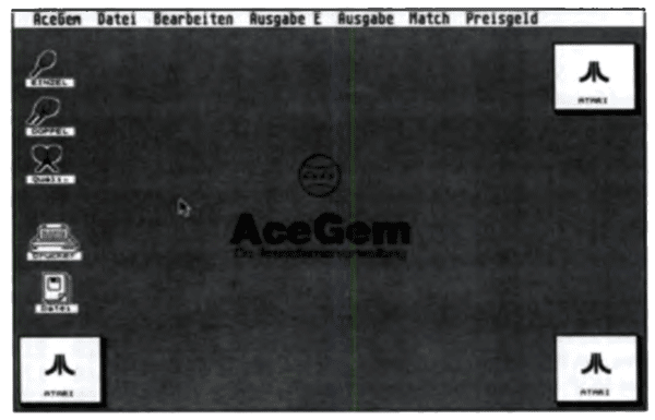 Auch für unsereins (also die Presse) bietet Cueto einen netten Service: eine Datenbank. Diese läßt sich dauernd abrufen und gibt kurze Lebensläufe der Spieler, die aktuellen Ergebnisse und die oben erwähnten Ausdrucke auf dem Monitor des Reporters frei. Einfacher geht es nicht mehr, hat man dadurch doch eine lückenlose Übersicht über die Geschehnisse auf den Spielfeldern. Die Bedienung des Hauptrechners wird durch die GEM-Oberfläche zum Kinderspiel. So muß nicht unbedingt ein ATARI ST-Erfahrener das Programm bedienen, sondern es kann durch jede halbwegs intelligente Aushilfskraft benutzt werden, die weiß, daß das Kästchen mit dem ATARI-Zeichen eine Maus ist. Auch für die Presse wird AceGem ziemlich einfach zu bedienen und benutzen sein, da mehrere Rechner miteinander vernetzt werden können und man so nicht andauernd mit Disketten, auf denen die aktuellen Ergebnisse enthalten sind, durch die Gegend laufen muß, um den sowieso schon gestreßten Reportern immer die neuesten Ergebnisse zum "eigenen" Rechner zu bringen. AceGem selbst ist, wie bereits erwähnt, GEM-unterstützt und deshalb sehr leicht zu bedienen. Eine Hardcopy des Programms sehen Sie in Bild 3.