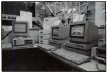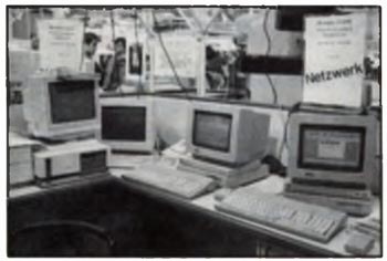 Bei Diplom-Ingenieur Praefeke war das Programm „PCB Layout“ zu begutachten. Es war an eine Ätzmaschine angeschlossen. Erstellte Platinen-Layouts können so innerhalb weniger Minuten schnell erstellt werden: Das Layout wird im Computer fertiggestellt und sofort auf die Ätzmaschine gegeben, die die Platine so erstellt, daß sie sofort benutzt werden kann. Das Programm kostet inklusive Ätzmaschine knapp DM 10.000,- und liegt damit im Gegensatz zu anderen professionellen Geräten dieser Art auf einem recht preiswerten Niveau. Weiterhin wurde hier das Programm „Malis“ vorgestellt, ein Programm für Malerbetriebe. Mit Malis ist es möglich, alle Schreibtischarbeiten, die ein Maler normalerweise durchzuführen hat, mit einem speziell auf Maler zugeschnittenen Programm zu erledigen. In der Software sind Aufmaßerfassung und -berechnung, Datenverwaltung. Angebotserstellung, Auftragsbestätigung. Arbeitszettel und Materialliste, Leistungskalkulation und Rechnungsschreibung enthalten.