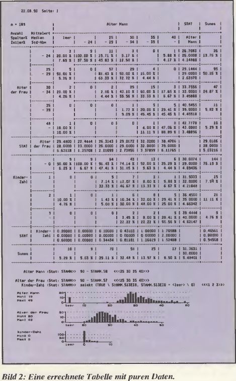 Alle eingehenden Daten werden vom ST verarbeitet. So können auch Problemstellungen wie “Korrelation zwischen Alter der Frau und mittlerer Zykluslänge” grafisch dargestellt werden, oder man erhält Datenmaterial über “alle katholischen Frauen über 25 mit einem bis zu 30 Jahre alten Mann, höchstens 2 Kindern und mindestens 12 Zyklusblättern”. Dabei entstehen dann solche Tabellen wie in Bild 2, die für wissenschaftliche Auswertungen hervorragend herangezogen werden können.