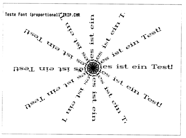 Zum Vergleich: die ROM-ZeichensĂ€tze des Atari ST lassen sich nur in 90°-Schritten drehen und maximal um den Faktor 2 vergröĂern. Auch auf den Atari soll nun das BGI portiert werden. Wer nicht solange warten will, wer nicht TURBO-C-Anwender ist, wer Platz sparen will (die Routinen sind sehr kurz) oder wer vielleicht bestimmte Spezialeffekte realisieren will, fĂŒr den ist das folgende Listing gedacht. In eigenen Programmen benötigen Sie nur folgende vier Routinen: