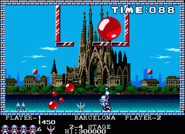 Bei diesem Spiel handelt es sich endlich um eine neue Spielidee. Es wird nicht auf Menschen, sondern auf Luftballons geschossen. Das Spiel beinhaltet insgesamt 50 spannende Levels. Sie müssen in einer bestimmten Zeit den gesamten Bildschirm von den erscheinenden Luftballons säubern. Das hört sich zuerst recht leicht an, Sie werden aber merken, daß Sie ganz schön gefordert werden. Wenn Sie nämlich einen Ballon getroffen haben, zerplatzt er nicht nur, sondern er verwandelt sich in zwei kleinere. Gewöhnlich entstehen aus einem Luftballon bis zu 16 weitere. Die Ballons bleiben nicht etwa im Schwebezustand. Sie dotzen auf dem Boden auf und steigen wieder in die Höhe. Da Sie sich am Boden befinden, müssen Sie aufpassen, nicht von einem der Luftballons berührt zu werden, sonst kostet Sie das ein Bildschirmleben. Je mehr Ballons auf dem Bildschirm herumdotzen, desto schwieriger wird Ihre Aufgabe. Sie müssen den Ballons geschickt ausweichen und sie so schnell wie möglich abschießen. Von Level zu Level steigt der Schwierigkeitsgrad. Die Screens ändern sich in fantasievolle Gebilde, in denen auch Plattformen vorkommen. Wenn Sie hinaufklettern, erhalten Sie einen besseren oder schnelleren Schuß. Viele Icons erscheinen nach erfolgreichen Schüssen auf den Screens. Wenn Sie sie berühren, sammeln Sie die verschiedensten Extras. Da gibt es z.B. Stoppuhren, die die Ballonbewegung einfrieren, oder Stunden ser, die einem mehr Zeit bewilligen, schnellen Schüsse, Dynamit und vieles andere. Am sten Spaß macht PANG im Zwei-Spieler-Modus. Die Grafik ist lustig aufgemacht und Spielwitz hervorragend. Ich kann dieses Spiel nur empfehlen!