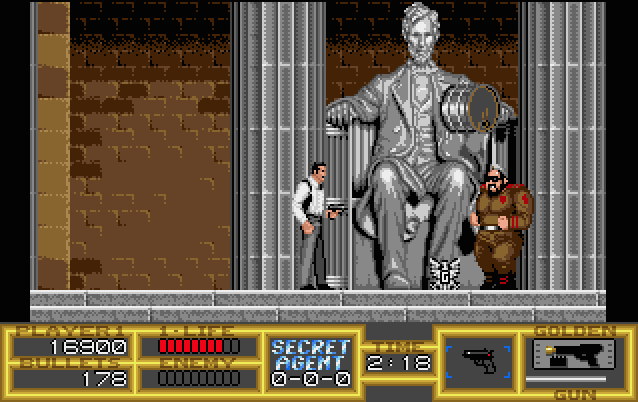 Dieses Spionage Action Spiel von DATA EAST bringt leichte Unterhaltung in den Computer. Es gibt insgesamt neun Levels, die von Ihrer Spielart gleich, aber von der Aufmachung her sehr verschieden sind. Bei SLY SPY SECRET AGENT handelt es sich um ein typisches Coin-Up-Spiel. Sie schlüpfen in die Rolle eines vielseitigen Agenten und müssen gegen das tyrannische Regime des "Council For World Dominatiod" kämpfen. Diese Organisation hat ein Land besetzt, das Sie nun befreien sollen. Sie starten als Fallschirmspringer an Bord eines Flugzeugs. Nach dem Ausstieg mit dem Fallschirm sind Sie sofort von einer Gruppe Terroristen umgeben, die auf Sie schießen. Sie brauchen sie nur zu töten, um selbst am Leben zu bleiben. Im nächsten Level trachtet man Ihnen ebenfalls nach dem Leben. Der kleine Unterschied ist nur die Grafik und daß man sich diesmal auf der Erde befindet. Guerillas schießen auf den Agenten, und Sie müssen ihn sicher durch die Stadt bringen. Viele Gegner und scharfe Hunde machen diese Aufgabe nicht leicht. Sie können sich durch das Aufsammeln verschiedener Gegenstände Zusatz-Features verschaffen. So besteht die Möglichkeit, eine goldene Superwaffe aus verschiedenen Einzelteilen zusammenzusetzen. Ein blinkendes "B" bringt Ihnen eine höhere Anzahl an Geschossen, eine Coladose steigert die Energie, und eine Uhr verlängert die knappe Zeit. Das folgende Level besteht aus Ballerei und einer Motorradjagd. Sie feuern auf gegnerische Fahrzeuge und Personen. Oft schweben Feinde mit einem Jetpack über der Straße. Auch sie trachten Ihnen nach dem Leben, so daß Sie sie mit einem Hochstand des Motorrades und einem gezielten Schuß töten sollten. Im nächsten Level gibt es Unterwasserkämpfe im Hafen der Stadt. Auch hier müssen Sie gegen Anhänger der Organisation kämpfen. Wenn Sie sich als 007 betätigen wollen, sollten Sie sich dieses Spiel einmal näher anschauen. Es ist ein gewöhnliches Spiel für nicht besonders geübte Joystick Akrobaten.