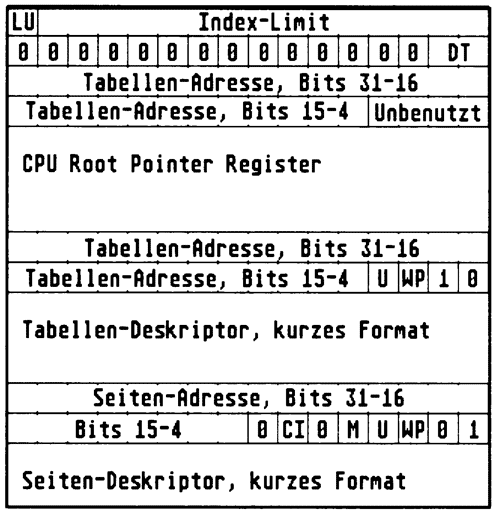 Voraussetzung für eine Adreßumrechnung per MMU ist die Aufteilung des Adreßraums in Abschnitte, für die jeweils ein eigener Umrechungsmodus eingerichtet werden kann. Diese Speicherabschnitte werden durch spezielle Datenstrukturen beschrieben, die man Deskriptor-Tabellen nennt. Eine solche Tabelle enthält wichtige Angaben darüber, wie die MMU den logischen Adreßraum auf den physikalisch vorhandenen Speicher abbilden soll. Das CRP stellt in erster Linie einen Pointer auf die erste dieser Deskriptor-Tabellen (Tabelle der Ebene 1) dar. Jede Tabelle muß auf einer durch 16 teilbaren Adresse beginnen. Somit genügen 28 Bits im CRP, um die Startadresse der ersten Tabelle zu definieren. Die Limit-Bits des CRP beschränken den Index in diese Tabelle nach oben (L/U=0) oder unten (L/U=1). Der Deskriptor-Typ (DT) gibt schließlich die Art der Deskriptor-Tabelle an. auf die das CRP zeigt.