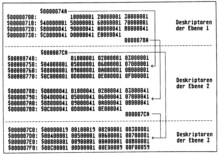 Die erste Deskriptor-Tabelle der Ebene 2 beginnt ab $0740 und beschreibt die Einteilung der ersten 256 MB des Adreßraums. Auch diese Tabelle enthält 16 Einträge, von denen jeder für einen Speicherbereich von 16 MB zuständig ist. Beim ersten Langwort handelt es sich um einen Tabellen-Deskriptor, alle anderen sind Seiten-Deskriptoren, die keinen besonderen Effekt für die Speicherzuteilung besitzen. Der logische Speicher wird hier direkt auf den physikalischen abgebildet.