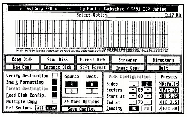 FCopy stellt eine Reihe von Funktionen zur Verfügung, um einen Kopiervorgang möglichst schnell und komfortabel ablaufen zu lassen. So bleibt dem Anwender zwar die Wahl, die Zieldiskette grundsätzlich während des Kopierens formatieren zu lassen, aber wenn man sich nicht um solche Feinheiten kümmern möchte, kann FCopy auch durchaus selbständig handeln. So entscheidet das Programm im Verlauf des Kopiervorgangs, ob es überhaupt nötig ist, die Zieldiskette zu formatieren. Besitzt diese nämlich ein Format, das dem der Quelldiskette gleicht, ist das zeitaufwendige Formatieren meist überflüssig. In diesem Fall beginnt FCopy gleich nach dem Einlesen der Daten mit dem Schreibvorgang. Zeigt sich während des Kopiervorgangs, daß eine Spur der Zieldiskette doch nicht dem erwarteten Format entspricht (z.B. weil die Diskette falsch oder nicht komplett formatiert war), reagiert FCopy derart, daß das Programm nun automatisch alle weiteren Spuren formatiert, um eine fehlerfreie Kopie zu gewährleisten. Bei Bedarf können von einer Diskette mehrere Kopien erzeugt werden, ohne daß hierzu die Quelldiskette mehrmals eingelegt werden müßte.