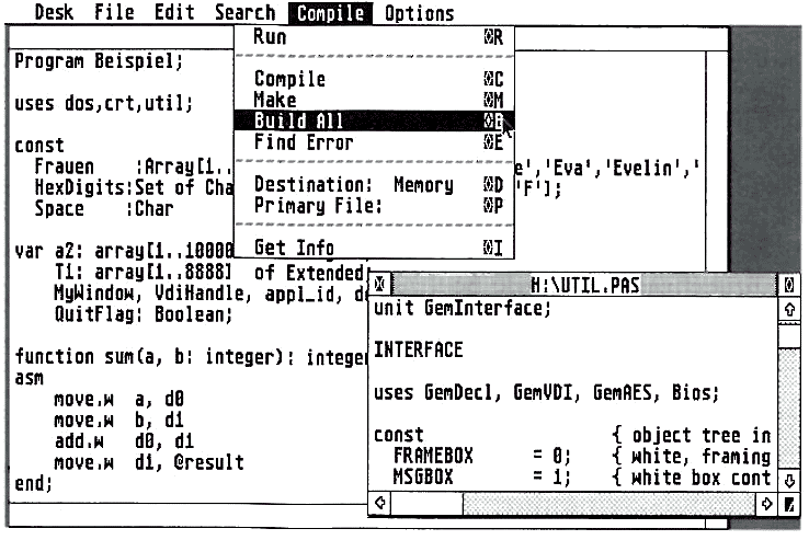 Geschwindigkeitsfanatiker können sich zur ‚Verbesserung’ ihrer Programme des eingebauten Assemblers bedienen. Funktionen und Prozeduren, die in Assembler geschrieben sind, beginnen statt mit begin mit asm. Aus einem solchen Block heraus kann man auf Pascal-Variablen zugreifen, wobei man sich jedoch an gewisse Konventionen halten muß. Der Assembler unterstützt wie der Compiler nur 68000er Mnemonics, sollte also in der Zukunft an größere Prozessoren angepaßt werden.