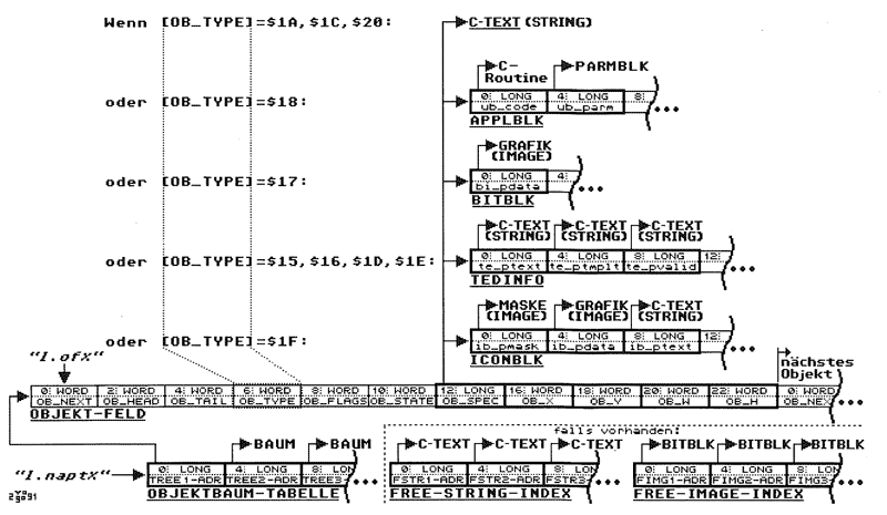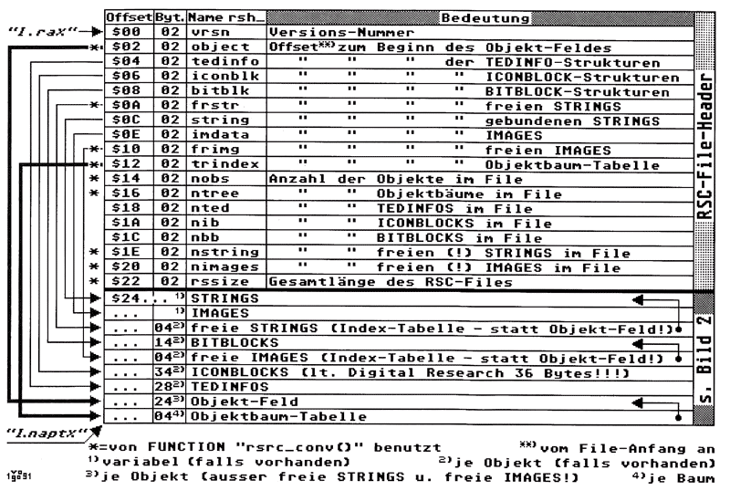 Ein Resource-File besteht aus festen und variablen Bestandteilen (Bild 1). Immer vorhanden ist der 36 Bytes lange File-Header mit Informationen über die Anzahl verschiedener Objektstrukturen und Zeigern, die in den nachfolgenden Datenbereich zeigen. Weil diese Zeiger alle Word-Format haben, ist die Größe einer Resource-Datei übrigens auf 64 kBytes begrenzt. Jedes Objekt (außer FREE-STRINGs und FREE-IMAGEs einschließlich Alert-Boxen) ist im Objektfeld mit einem 24 Bytes umfassenden Eintrag vertreten. Und jedem Baum (also mehrere Objekte zu dem Gebilde zusammengefaßt, das dann auf dem Bildschirm erscheint) wird in der Objektbaumtabelle ein 4 Bytes langer Zeiger spendiert. Außerdem reichen den meisten Objekten die 24-Byte-Einträge nicht aus, so daß es einen Zeiger im Objektfeld gibt (OB SPEC), der dann auf eine weitere Struktur (z.B. die berühmten „TEDINFO“-Blöcke) weist, in der nochmal bis zu drei Zeiger auf die eigentliche Information im Resource-File zeigen (C-Text und Image-Blöcke). Bild 2 versucht dies zu verdeutlichen. Alle dort stark umrandeten Felder müssen von rsrc_conv() so angepaßt werden, daß das AES mit den Daten etwas anfangen kann (sehr ausführlich in [1] beschrieben).