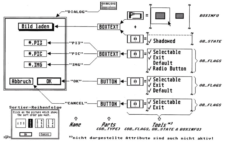 Alle Objekte, auf die vom Programm reagiert werden soll, müssen (in diesem Beispiel hier - es geht auch anders...) je ein gesetztes Selectable- und Exit-Flag und einen Namen haben. Das Anklicken der drei Auswahl-Buttons führt im laufenden Programm nicht zum Beenden des Dialoges, weshalb diese Buttons aus Boxtext-Objekten gebildet wurden und so einen schmalen Rand haben. Pro Objektbaum darf außerdem ein Default-Objekt definiert sein - also das Objekt, das auch mit der RETURN-Taste angesprochen werden kann. Üblich ist hier der „OK“-Button.
