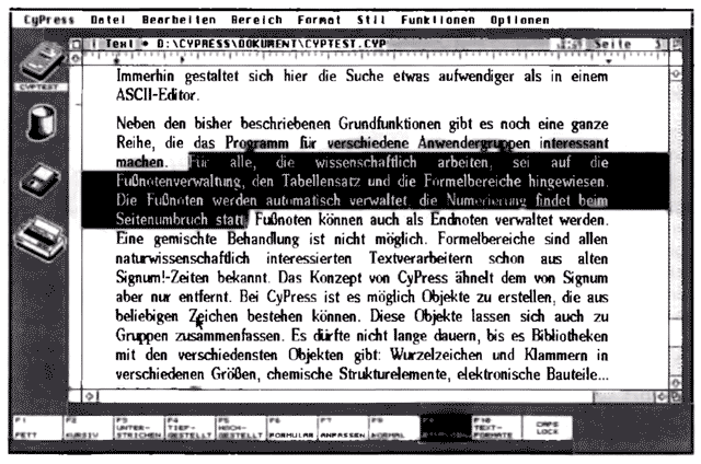 Neben den bisher beschriebenen Grundfunktionen gibt es noch eine ganze Reihe anderer, die das Programm für verschiedene Anwendergruppen interessant machen. Für alle, die wissenschaftlich arbeiten, sei auf die Fußnotenverwaltung, den Tabellensatz und die Formelbereiche hingewiesen. Die Fußnoten werden automatisch verwaltet, die Numerierung findet beim Seitenumbruch statt. Fußnoten können auch als Endnoten verwaltet werden. Eine gemischte Behandlung ist nicht möglich. Formelbereiche sind allen naturwissenschaftlich interessierten Textverarbeitern schon aus alten Signum!-Zeiten bekannt. Das Konzept von CyPress ähnelt dem von Signum! aber nur entfernt. Bei CyPress ist es möglich, einzelne Objekte zu erstellen, die aus beliebigen Zeichen bestehen können. Diese Objekte lassen sich zu Gruppen zusammenfassen. Es dürfte nicht lange dauern, bis es Bibliotheken mit den verschiedensten Objekten gibt: Wurzelzeichen und Klammern in verschiedenen Größen, chemische Strukturelemente, elektronische Bauteile... Es lebe die Phantasie.