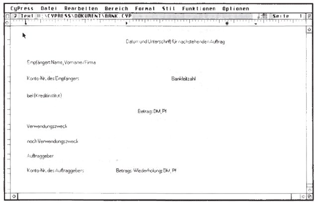 Wie bereits erwähnt, lassen sich mit CyPress auch Serienbriefe erstellen. Wer 1st-Address oder 1st-Base besitzt, hat es besonders einfach, da eine Schnittstelle für diese Datenbankprogramme in CyPress integriert ist, die direkt auf die Accessory-Versionen zugreifen kann. Darüber hinaus ist auch der Import von Daten aus anderen Programmen möglich, wobei die Elemente eines Datensatzes in einer ASCII-Datei stehen müssen. Die Datenfelder müssen entweder eine definierte Länge haben oder durch ein zu definierendes Zeichen getrennt sein. Im Dokument müssen Platzhalter für die Datenelemente eingetragen werden. Diese Symbole haben eine Entsprechung in der Datenbank. Auch Datum und Zeit können in verschiedenen Formaten als Symbol eingetragen werden, so daß beim Drucken des Briefes immer das richtige Tagesdatum gedruckt wird, wenn die Systemuhr stimmt. Den Datenelementen wird in einer Tabelle je ein Platzhalter zugewiesen. Damit steht dann der persönlichen Massenpost nichts mehr im Wege. Die Möglichkeiten des Datenimports sind ausreichend und nach kurzer Einarbeitungszeit problemlos zu handhaben. Schließlich ist es auch noch möglich, Formulare zu definieren. Als Beispiel liegt ein Überweisungsformular bei. Wirklich hübsch. Im Formularmodus lassen sich Textänderungen nur in den dafür vorgesehenen Bereichen durchführen, alle wesentlichen Textverarbeitungsfunktionen stehen zur Verfügung.