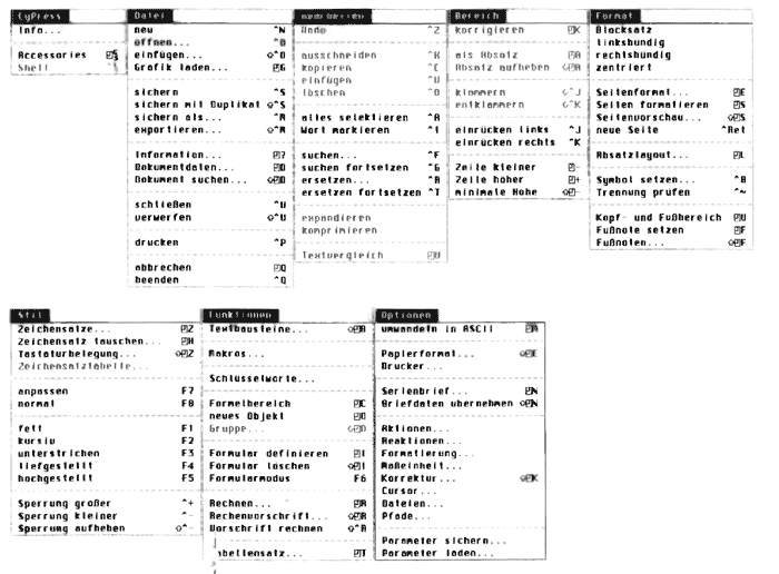 Beim ersten Start von CyPress war ich von der Fülle der Menüs schier erschlagen. Immerhin sind die Menüs in Gruppen gegliedert, und auch sonst erinnert die Bedienoberfläche sehr an ein bekanntes Buch eines inzwischen noch bekannteren Zwillingspaares. CyPress verfügt über eine sehr komfortable Benutzeroberfläche, die nur auf den ersten Blick wie das GEM des Atari aussieht. Die gesamte Oberfläche ist neu programmiert und ergänzt das Bekannte um viele sinnvolle Funktionen.