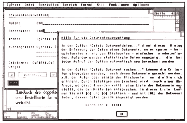 CyPress reagiert angenehm schnell auf Eingaben und hat einen flüssigen Bildschirmaufbau. Es läuft auch nichts nach. Die Tastaturbefehle zum Bewegen des Cursors sind vollständig und halten sich im wesentlichen an die bekannten Standards. Eine Hilfefunktion steht in den meisten Dialogfeldern zur Verfügung, nicht jedoch in der Menüleiste. Eine Rarität unter den Textverarbeitungen für den ST/TT ist die Dokumentenverwaltung. Spätestens beim ersten Speichern eines Dokumentes fragt Cypress nach einigen Zusatzinformationen: Autor, Bearbeiter, Titel, Stichwörter. Trägt man diese Daten ein, kann man später schnell nach Dokumenten suchen, ohne alle öffnen zu müssen. Doch zurück zur Textbearbeitung.