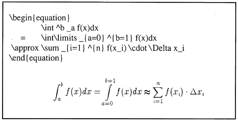 Wie schon erwĂ€hnt, erstellt man seinen Text im ASCII-Format und lĂ€Ăt ihn dann von TeX in das gewĂŒnschte Dokument ĂŒbersetzen. Um dem Programm mitzuteilen, welche Textabschnitte als Formel gesetzt werden sollen, schlieĂt man sie in sog. Umgebungen ein. Dies erreicht man z.B. mit den Befehlen: