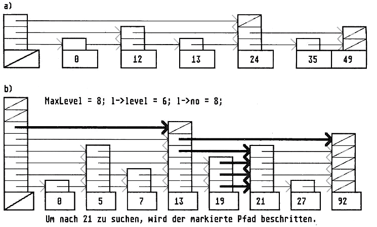 Begriffen? In dem Fall schauen Sie sich jetzt Bild 4a an. Dort ist eine sequentielle Liste mit dargestellt, mit jeweils verschiedener Anzahl von Verweisen auf weiter hinten liegende Elemente. Wenn wir in dieser Liste einen SchlĂŒssel (hier eine Zahl) suchen, folgen wir, von vorne beginnend, zuerst den Pfeilen, die am weitesten nach hinten zeigen (den oberen). Ist der SchlĂŒsselbegriff in der Information, auf die der Pfeil steht, kleiner oder gleich demjenigen, den wir suchen, setzen wir die Suche mit der Gruppe von Pfeilen fort, die PI mal Daumen nur noch halb so weit zeigen. Das setzen wir solange fort, bis wir entweder das Element gefunden haben, oder wir bei Level 0, d.h. der Pfeil zeigt auf das nĂ€chste Element in der sortierten Liste, angekommen sind. Alles klar? Das ist das Prinzip.