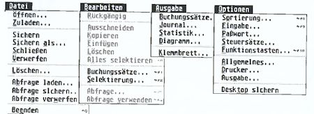 Wo Version 1 noch alleine mit Menüs auskommen mußte, hat man SALDO 2 ein eigenes Desktop beschert. Menüs gibt es natürlich immer noch (siehe Bild 2), und sie sind erfreulich überschaubar. Die Oberfläche (siehe Bild 1) zeigt neben der Menüleiste vier Icons für Drucker, Massenspeicher, Klemmbrett und Papierkorb und ein Infofensterchen. Während man bei der Programm Version 1 noch abschätzen mußte, wieviele Buchungssätze wohl auf welches Speichermedium (auch Arbeitsspeicher) passen, zeigt jetzt dieses Infofenster neben der Gesamtzahl der Sätze in der (aktivierten) Buchungsdatei auch die Menge der durch Abfrage oder Selektion herausgezogenen Sätze und den noch freien Platz an.